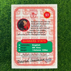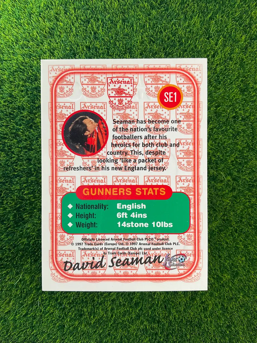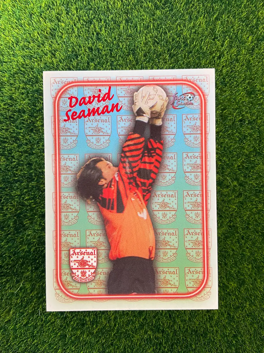 A vintage collectible of the legendary Arsenal goalkeeper, David Seaman. This is the 1997 AFC Fours card. This card is part of a four-card puzzle that creates a full image. A fun and nostalgic piece of memorabilia from the late 90s for any Gooner.
