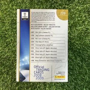 A vintage holographic card celebrating a goalkeeping great. This is the 2008-09 Panini UEFA Champions League Petr Cech “Best Goalkeeper” holo card. This card, from over a decade ago, honors the Chelsea legend’s status as one of the best in the world. The holographic finish makes it a standout piece from that era. A great collectible for any Chelsea fan.