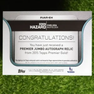 A premium card of a modern football magician! This is the 2015 Topps Premier Gold Eden Hazard Premier Jumbo Autograph Relic, numbered to 50. This card has it all: a certified on-card autograph from Eden Hazard, and a jumbo-sized piece of player-worn memorabilia. The Topps Premier Gold set is known for its high-quality offerings, and this card is a prime example. It captures Hazard during his prime at Chelsea, where he was one of the most exciting players in the world. For collectors of high-end, multi-relic cards, this is a fantastic and valuable piece.