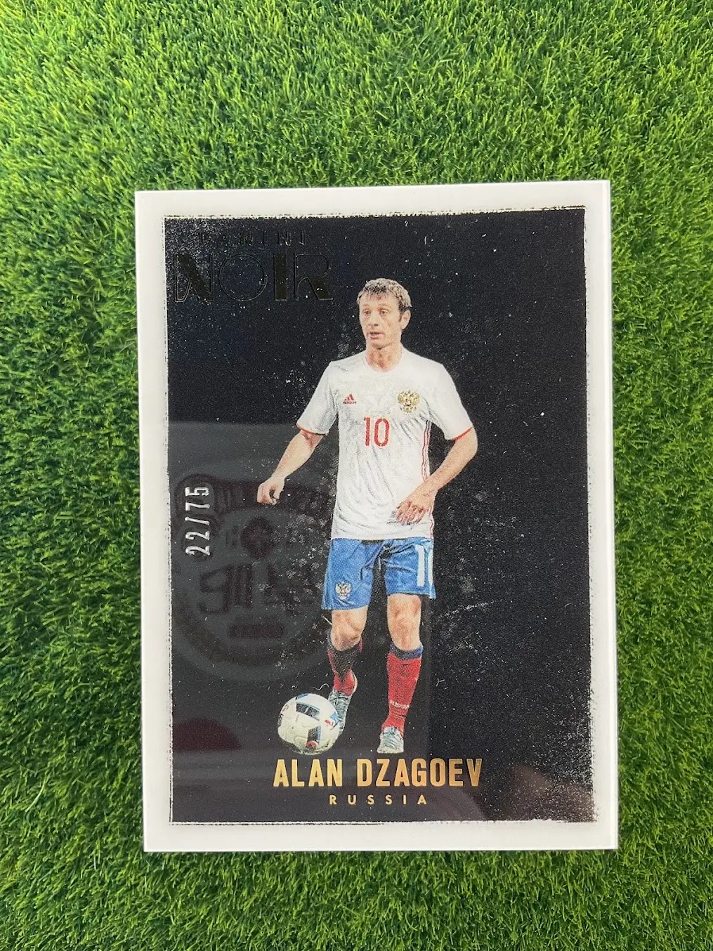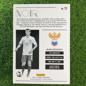 A sophisticated collectible of the talented Russian midfielder, Alan Dzagoev. This is the 2016-17 Panini Noir card. Known for its elegant, monochrome design, the Noir series offers a unique and artistic take on sports cards. This is a limited edition short print, hand-numbered 22 out of just 75 copies. A stylish addition for any collector of Russian football or unique card sets.