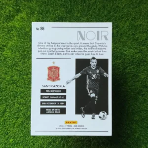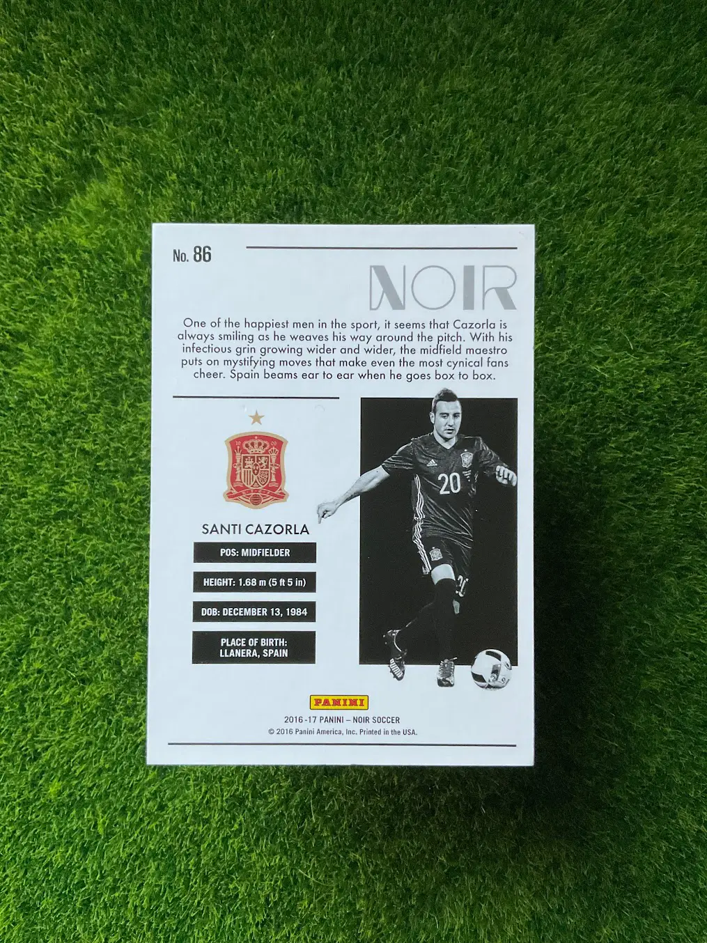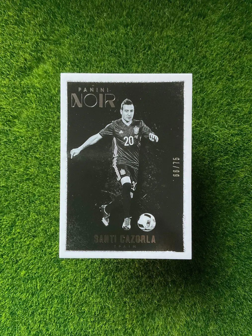 A classy card for a classy player. This is the 2016-17 Panini Noir card of the Spanish midfield magician, Santi Cazorla. The Noir series is known for its elegant and artistic design, and this card is a perfect tribute to a player beloved by fans for his technical skill. This is a limited edition short print, hand-numbered 66 out of just 75 copies made.