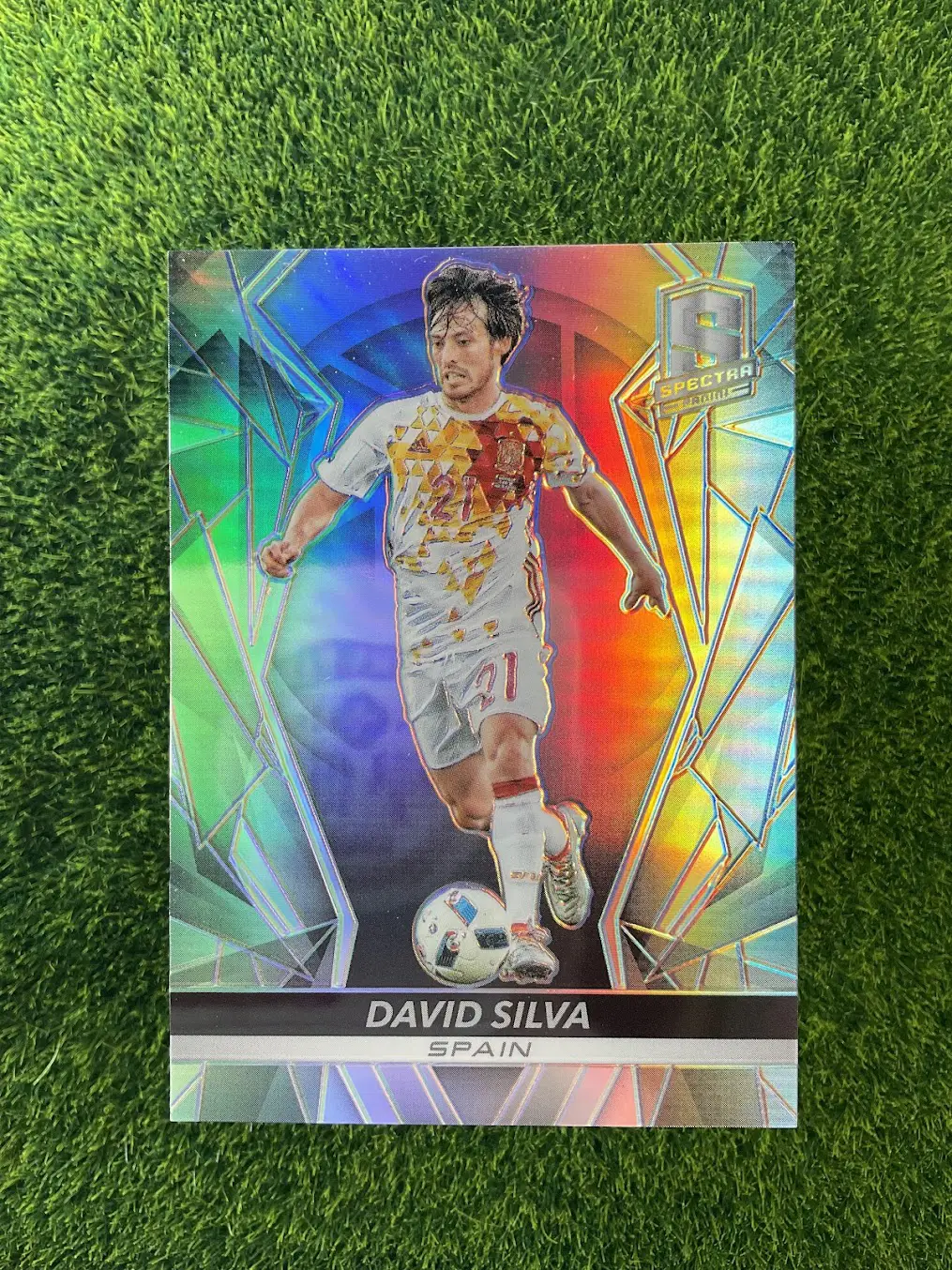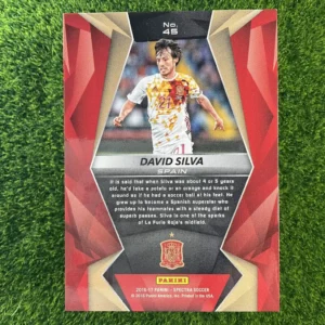 A dazzling parallel card of the Spanish magician, David Silva. This is the 2016-17 Panini Spectra Prizm. The Spectra series is famous for its brilliant and colorful designs, and this Prizm parallel is a great example. It captures the legendary Manchester City and Spain midfielder in a truly eye-catching way. A fantastic card for any collector who appreciates modern card design.