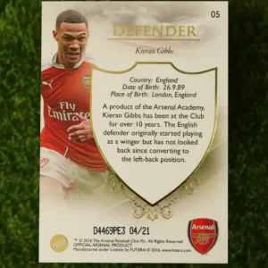 A rare card of a homegrown talent! This is the 2016 Futera Arsenal Kieran Gibbs, numbered to a limited 21 copies. This card from the high-quality Futera Arsenal set features the English left-back Kieran Gibbs, a player who came up through the famous Arsenal academy. Gibbs was a reliable and athletic defender for the club for many years. This limited card is a fantastic tribute to his time at his boyhood club and a great collectible for any fan who appreciates the players who have come through the Arsenal system.