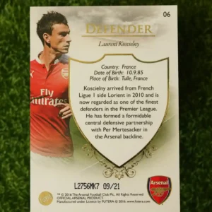 A rare card of a true Arsenal warrior! This is the 2016 Futera Arsenal Laurent Koscielny, numbered to a limited 21 copies. This card from the high-quality Futera set features the French central defender, Laurent Koscielny. Known for his bravery, pace, and leadership, “Kos” was the captain of the club and a rock at the heart of the Arsenal defense for many years. This limited card is a fantastic tribute to a player who always wore his heart on his sleeve. A must-have for any fan who admired his commitment to the club.