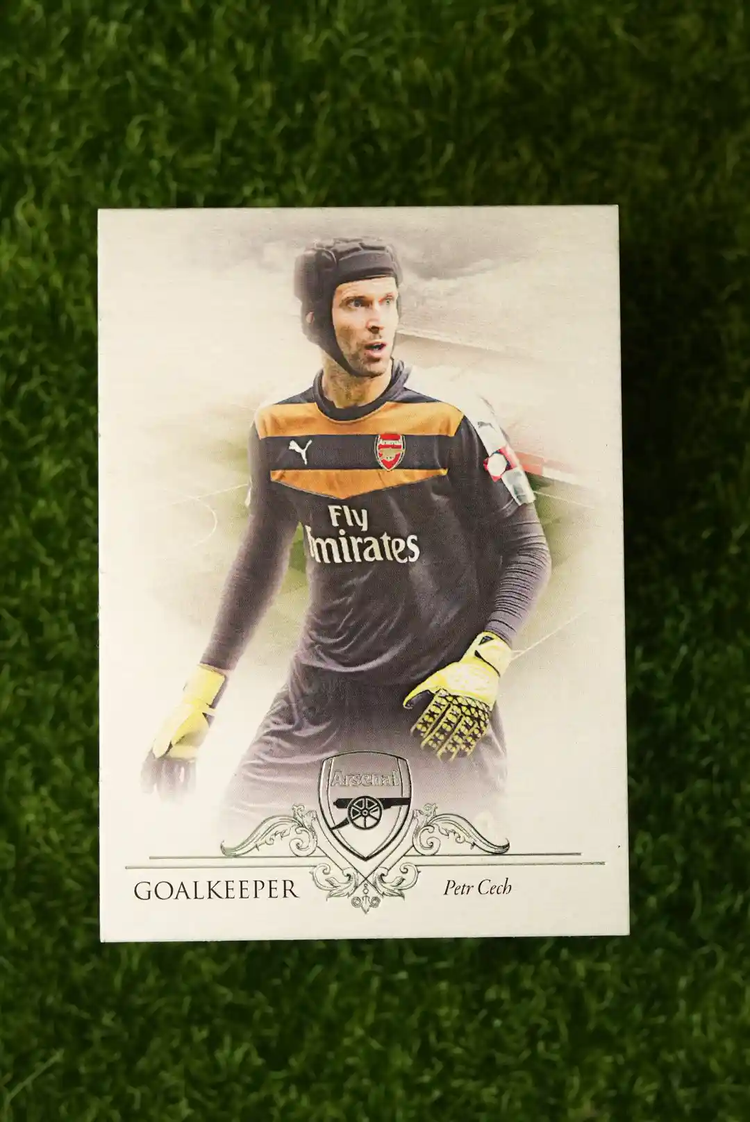 A limited card of a true goalkeeping legend! This is the 2016 Futera Arsenal Petr Čech, numbered to just 21. This card from the specialty Futera set features the iconic goalkeeper Petr Čech during his time at Arsenal. After a legendary career at Chelsea, Čech brought his experience and class to the other side of London. This rare card is a great tribute to a player who is widely regarded as one of the greatest goalkeepers in Premier League history. A fantastic collectible for any fan of the player or collector of goalkeeping greats.