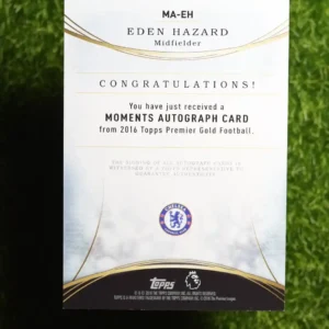 Another fantastic autograph from a Chelsea icon! This is the 2016 Topps Premier Gold Eden Hazard Moments Autograph, numbered to 100. Just like the John Terry card from the same series, this ‘Moments’ insert commemorates a specific highlight from Eden Hazard’s incredible career. The on-card autograph adds a personal touch from the player himself. For fans of Hazard’s dazzling skill and unforgettable goals, this card is a perfect collectible. The limited print run of 100 makes it a desirable piece for any collector of modern soccer stars.