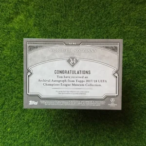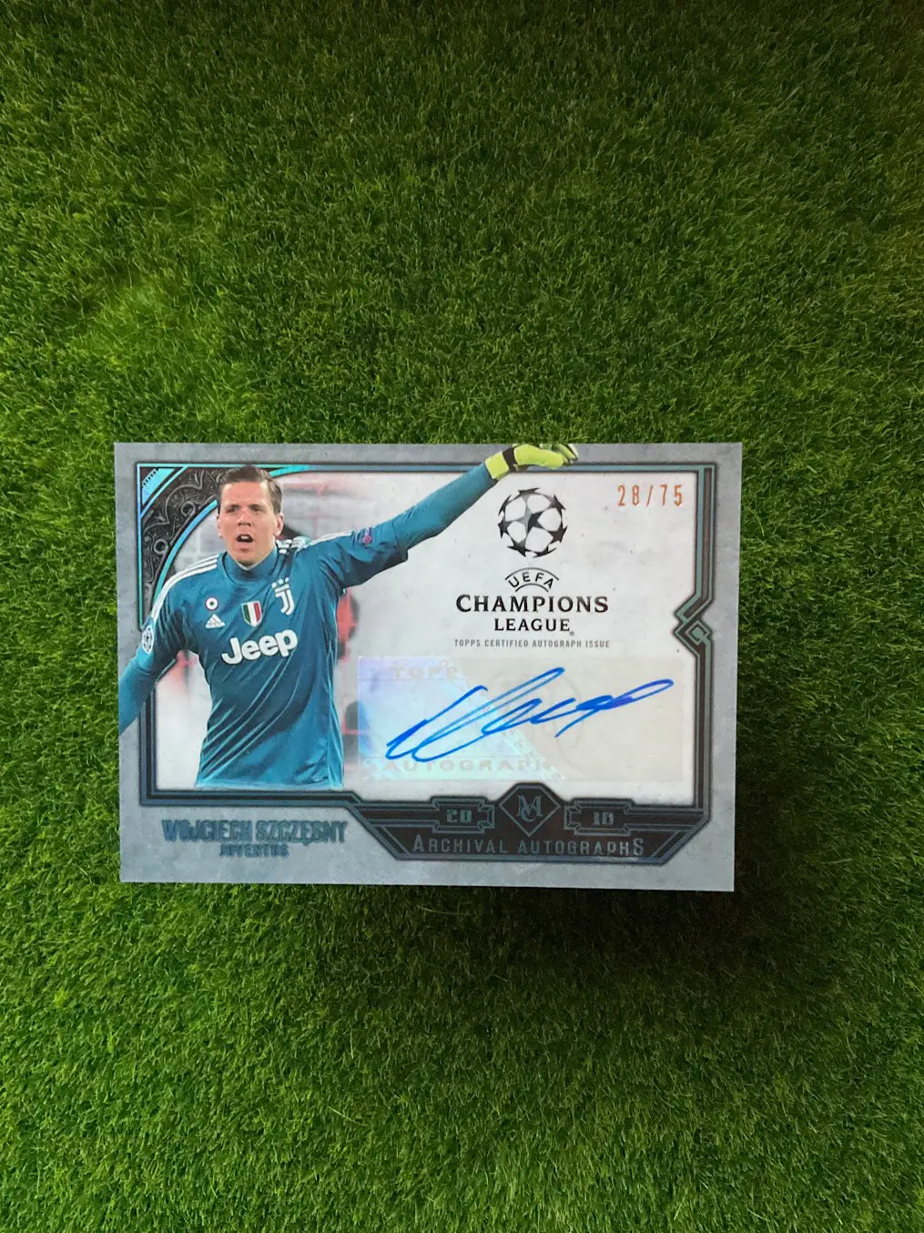 A sophisticated and stylish autographed card of Wojciech Szczęsny. This 2017-18 Topps Museum Collection “Archival Auto” is a premium collectible featuring a certified signature from the Juventus and Poland international goalkeeper. The Museum Collection is known for its elegant design and high-quality on-card autographs. This card is a limited edition, hand-numbered 28 out of 75, making it a desirable item for collectors and fans of the former Arsenal and Roma shot-stopper.