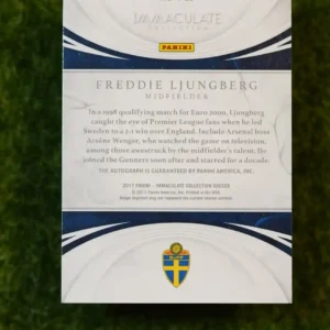 A magnificent autograph from another member of the “Invincibles”! This is the 2017 Panini Immaculate Collection Freddie Ljungberg Historical Significance Auto, numbered to just 10. The Immaculate Collection is a top-tier brand, and the ‘Historical Significance’ insert is a perfect tribute to players like Freddie Ljungberg who have a special place in their club’s history. This card features a beautiful on-card autograph from the Swedish winger. The combination of the high-end brand, the on-card auto, and the extreme rarity makes this a true centerpiece for any serious Arsenal collection.