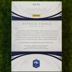 A premium autograph of a true midfield general! This is the 2017 Panini Immaculate Collection Patrick Vieira Historical Significance Auto, numbered to 50. This card from the high-end Immaculate set features an on-card signature from the legendary Arsenal captain, Patrick Vieira. As the leader of the “Invincibles,” Vieira is one of the most iconic players in Premier League history. This ‘Historical Significance’ card is a fitting tribute to his incredible career. For any Arsenal fan or collector of football legends, this is a must-have autograph from a top-tier brand.