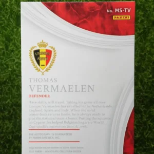 Own a certified autograph from the former Arsenal captain and Barcelona defender, Thomas Vermaelen. This 2017 Panini Immaculate Collection “Marquee Signatures” card is a premium collectible for fans of the Belgian international. The card boasts a crisp, on-card signature, a signature feature of the high-end Immaculate brand. This piece is a limited edition short print, hand-numbered 24 out of only 35 in existence. It’s a fantastic memento for supporters of the clubs he played for and a great addition to any collection of international football stars.
