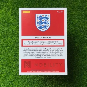 A great card of an English goalkeeping great. This is the 2017 Panini Nobility David Seaman card. The Nobility set has a classic and regal design, fitting for a player of Seaman’s stature. This is a numbered limited edition, 119 out of 199. A fantastic collectible for any fan of “Safe Hands.”