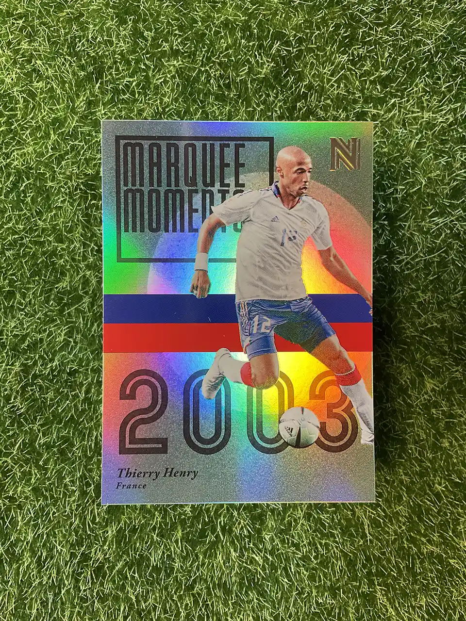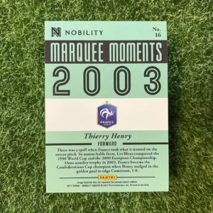 A card that captures an iconic moment in football history. This is the 2017 Panini Nobility Thierry Henry “Marquee Moments” insert. This card commemorates a key moment from the legendary striker’s career. A fantastic collectible for any fan of the Arsenal and France superstar.