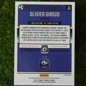 The classic chromium parallel of a World Cup winner! This is the 2018-19 Donruss Optic Olivier Giroud Holo. The Donruss Optic brand is a staple of the modern hobby, and the Holo (or Silver) parallel is the most iconic and recognizable version of the base card. This card features the French striker Olivier Giroud, a player who has won numerous trophies, including the World Cup. The timeless design and shimmering finish of the Holo parallel make this a must-have for any fan of the player or collector of the Optic set.