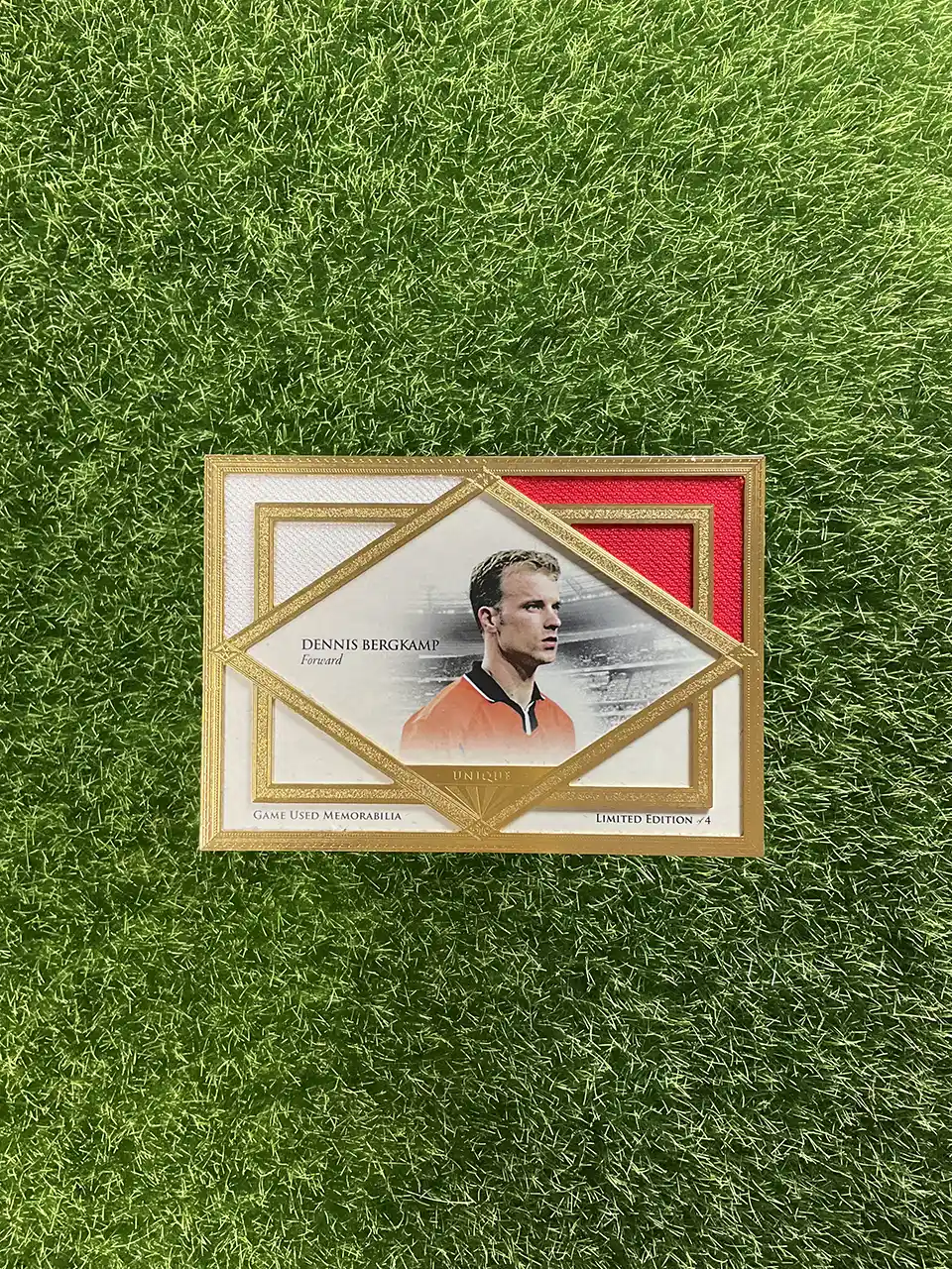 An ultra-rare memorabilia card of the Dutch legend. This is the 2018 Futera Unique Dennis Bergkamp patch card, numbered to just 4. This premium card features an authentic, player-worn patch from the Arsenal icon. Futera is known for its high-quality, limited edition cards, and this super short print (SSP), numbered 3/4, is a prime example.