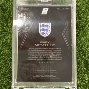A unique and precious metal collectible of a Manchester United legend. This is the 2018 Panini Eminence “Living Legends” card of Gary Neville, featuring an embedded silver bar and numbered to just 10. This ultra-premium card is a tribute to the legendary status of the “Red Devil.” Numbered 05/10, this is a rare and valuable item.