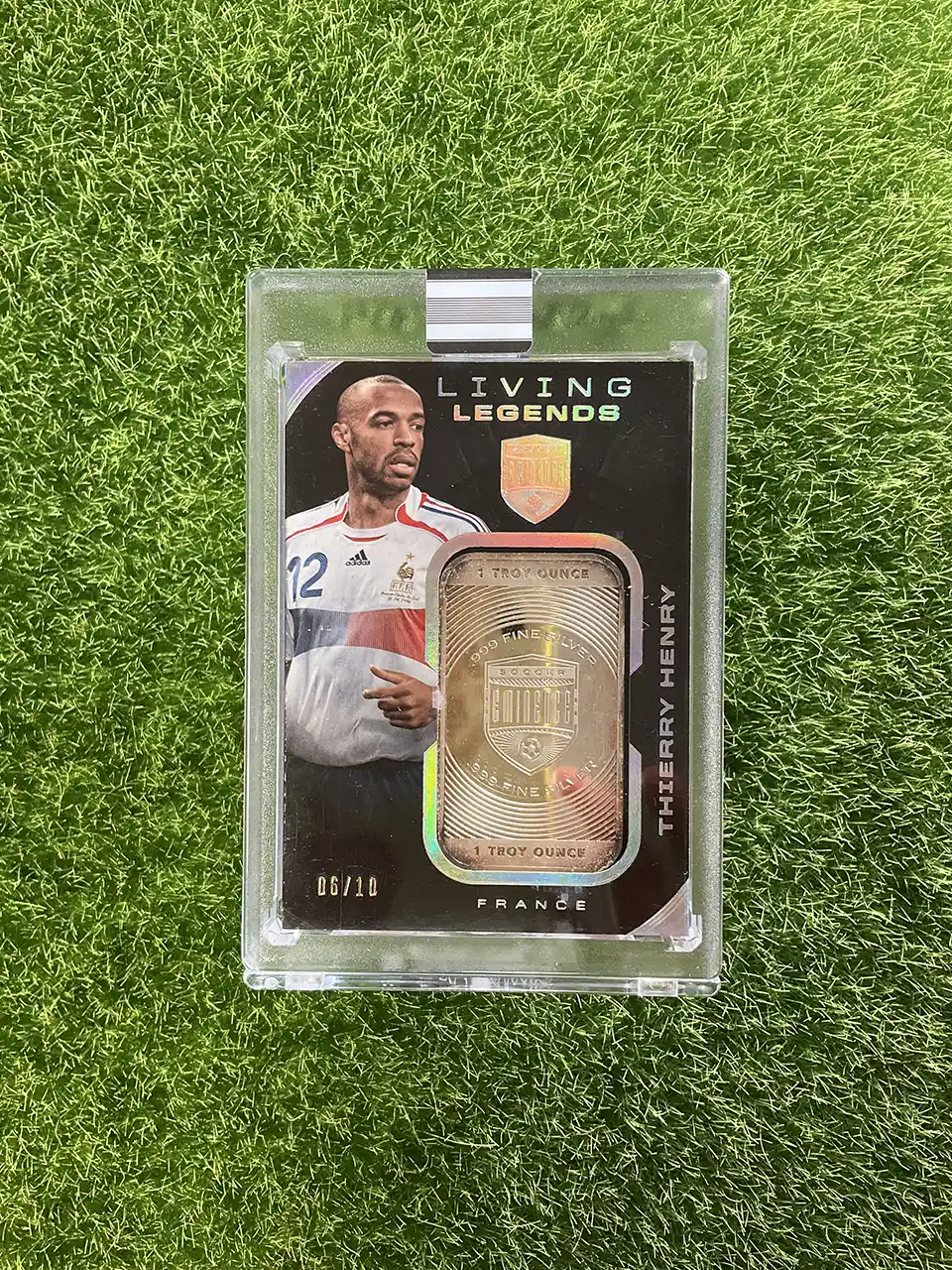 A unique collectible for a living legend. This is the 2018 Panini Eminence Soccer Thierry Henry “Living Legends” card, featuring an embedded silver bar and numbered to 10. From the ultra-premium Eminence set, this card is a rare and valuable tribute to the Arsenal and France superstar. Numbered 06/10, this is a must-have for any high-end collector.