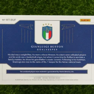 Own a piece of the game with this premium memorabilia card. This is the 2018 Panini National Treasures Gianluigi Buffon “Material Treasures” patch card. This high-end collectible features an authentic, player-worn jersey patch. This is a limited edition, numbered 29 out of 35. A must-have for any serious collector.