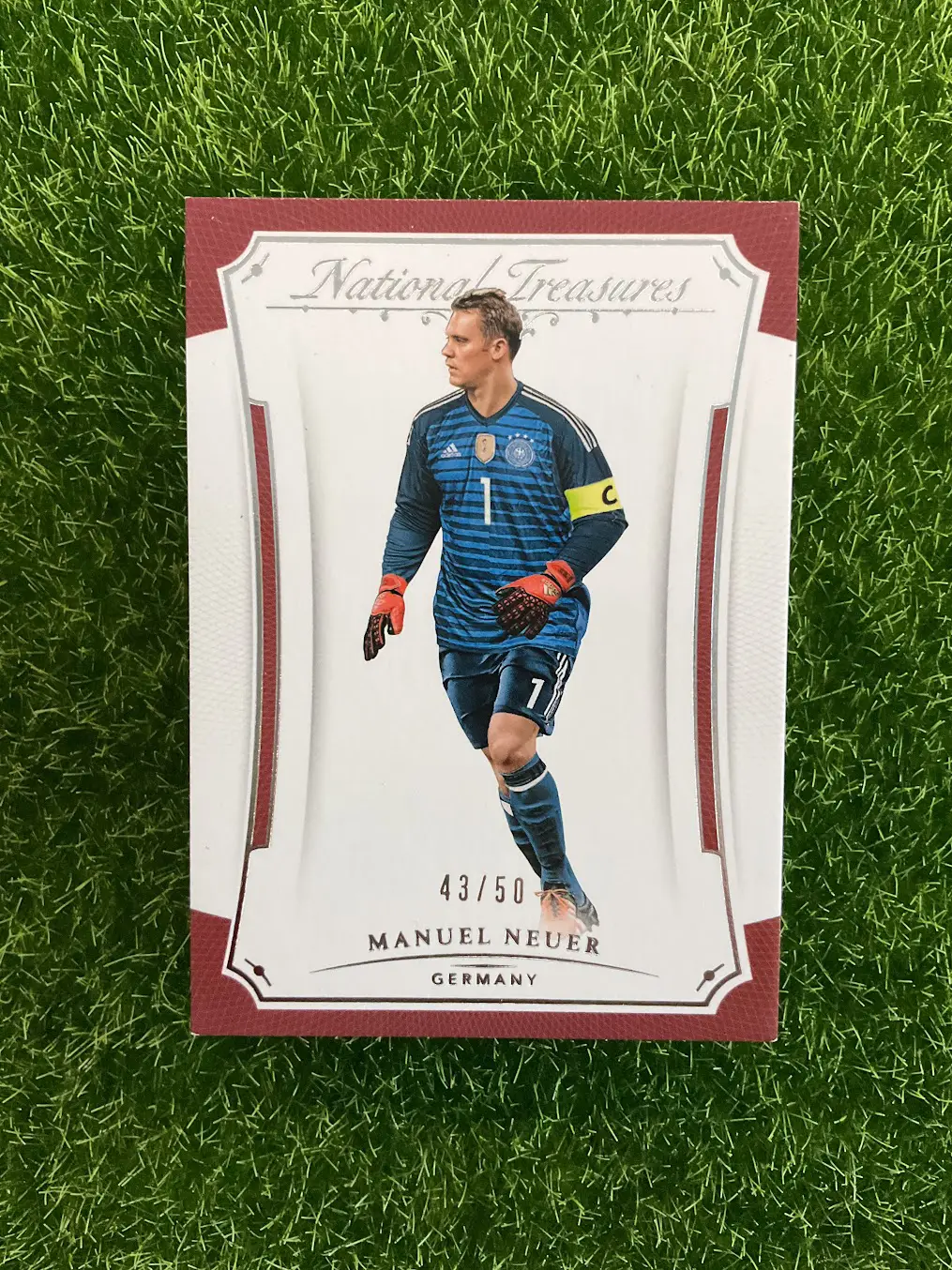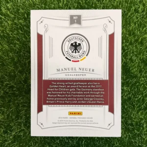 A premium collectible for one of the greatest goalkeepers in football history. This is the 2018 Panini National Treasures Manuel Neuer card, limited to just 50 copies. National Treasures is one of Panini’s most elite and sought-after brands, known for its high-quality stock and rarity. This card of the Bayern Munich and Germany legend is hand-numbered 43/50, making it a valuable addition to any world-class collection. Don’t miss the chance to own a piece of memorabilia from a true icon of the sport, a player who redefined his position.