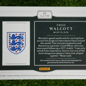 A “bookend” numbered, ultra-rare memorabilia and autograph card. This is the 2018 Panini National Treasures “Colossal” jumbo patch auto of Theo Walcott, numbered 10/10. This incredible card features a massive, game-worn patch alongside a certified on-card signature. As the last card in this extremely short print run, it holds significant collector appeal. This is a true holy grail item for any fan of Theo Walcott, Arsenal, or Everton.