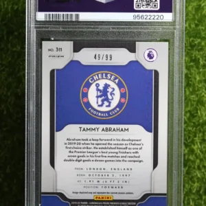 Another chance to get a numbered rookie card of Tammy Abraham! This is the 2019-20 Panini Chronicles Tammy Abraham Prizm Update Blue Ice, this one numbered 49/99. The ‘Blue Ice’ parallel is a sharp-looking design that adds a nice touch of color and scarcity to this popular rookie card. Whether you’re a fan of Chelsea, AS Roma, or the England national team, this card is a great way to celebrate the career of a talented forward. The limited print run of 99 makes it a desirable collectible, and it’s a great addition to any modern Premier League collection.