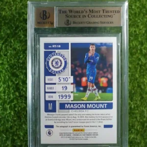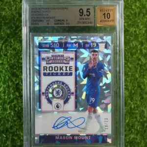 & Free Shipping2019-20 Panini Contenders Soccer Mason Mount Rookie Ticket Cracked Ice Rookie Card, a Cracked Ice Parallel Autograph, printed to just 23 copies. The card is #18 and graded BGS 95.