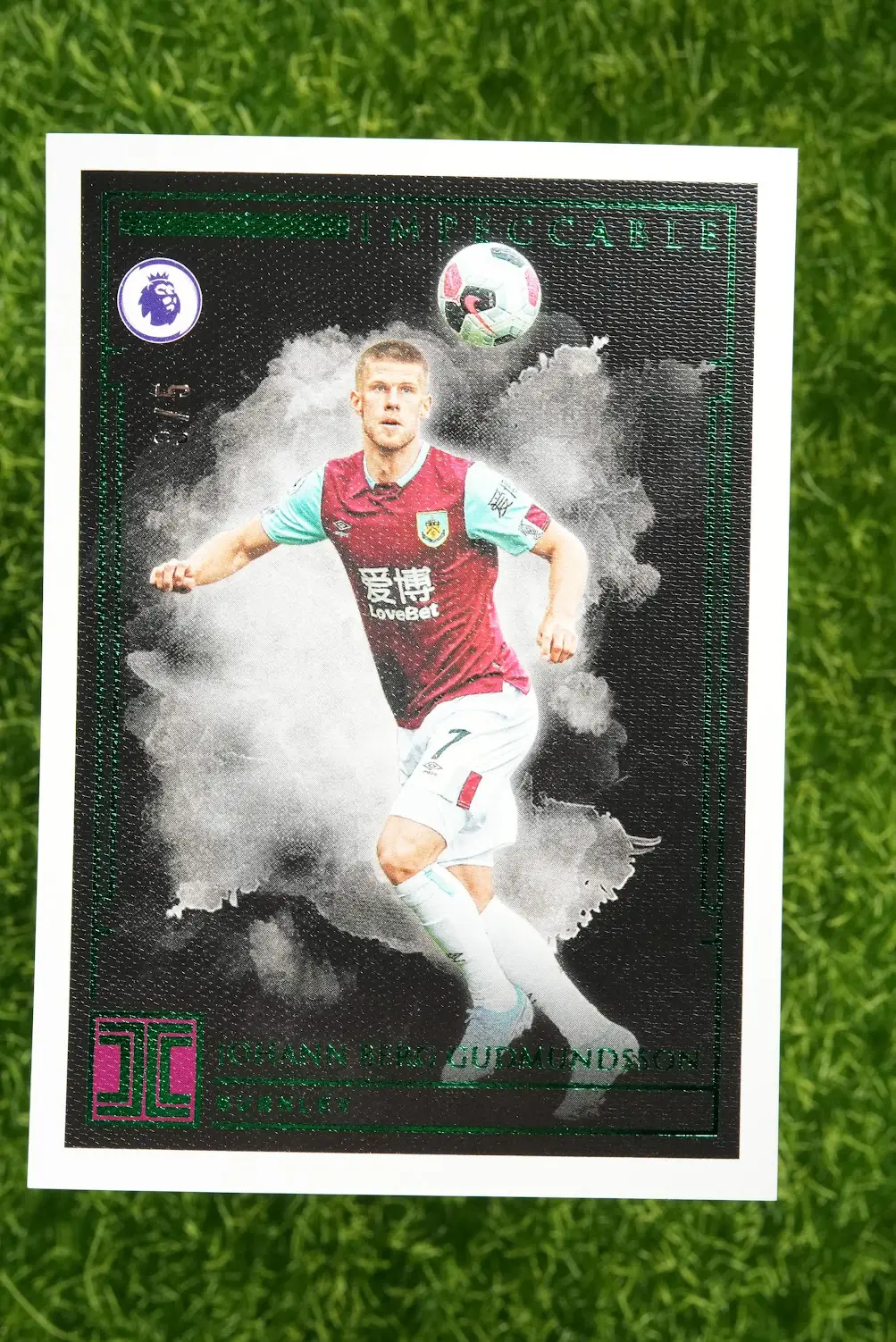 An exceptionally rare card of the Icelandic international, Johann Berg Gudmundsson. This is the 2019-20 Panini Impeccable card, numbered to just 5. This super short print (SSP), numbered 5/5, is a true holy grail for any fan of the Burnley star.