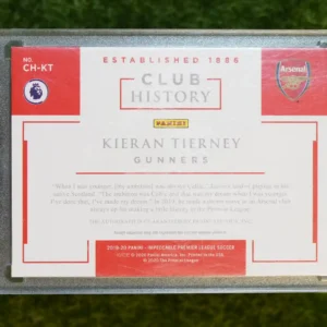 A premium rookie patch autograph of a defensive dynamo! This is the 2019-20 Panini Impeccable Kieran Tierney Club History Gunners Patch Auto, numbered to 86. This high-end card from the Impeccable set features a certified on-card autograph from Kieran Tierney, alongside a piece of player-worn material. The ‘Club History’ insert is a fantastic tribute to the player’s new beginning at Arsenal. As a rookie patch auto from a premium brand, this is a key card for any serious Kieran Tierney or Arsenal collector.