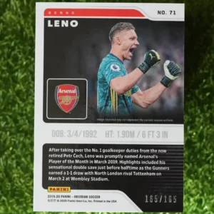The last in the run from a premium brand! This is the 2019-20 Panini Obsidian Bernd Leno, numbered 165/165. Just like the Aubameyang card, this is a base card from the high-end Obsidian set. However, as the “bookend” final card in the print run, it holds a special appeal for many collectors. It’s a great way to own a limited and special card of the German goalkeeper. For fans of Bernd Leno or collectors of the Obsidian set, this is a fantastic and unique piece to add to their collection.