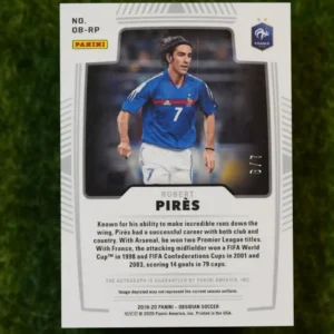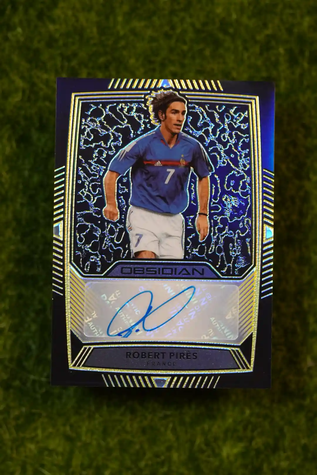 An ultra-rare autograph from an Arsenal “Invincible”! This is the 2019-20 Panini Obsidian Robert Pirès Autograph, with a tiny print run of just 7 copies. This card from the sleek and modern Panini Obsidian set features a certified on-card signature from the legendary French winger, Robert Pirès. As a key member of the famous “Invincibles” team, Pirès is a true Arsenal legend. This extremely limited autograph is a fantastic and valuable collectible for any fan of that historic team or any collector of high-end, rare soccer autographs.