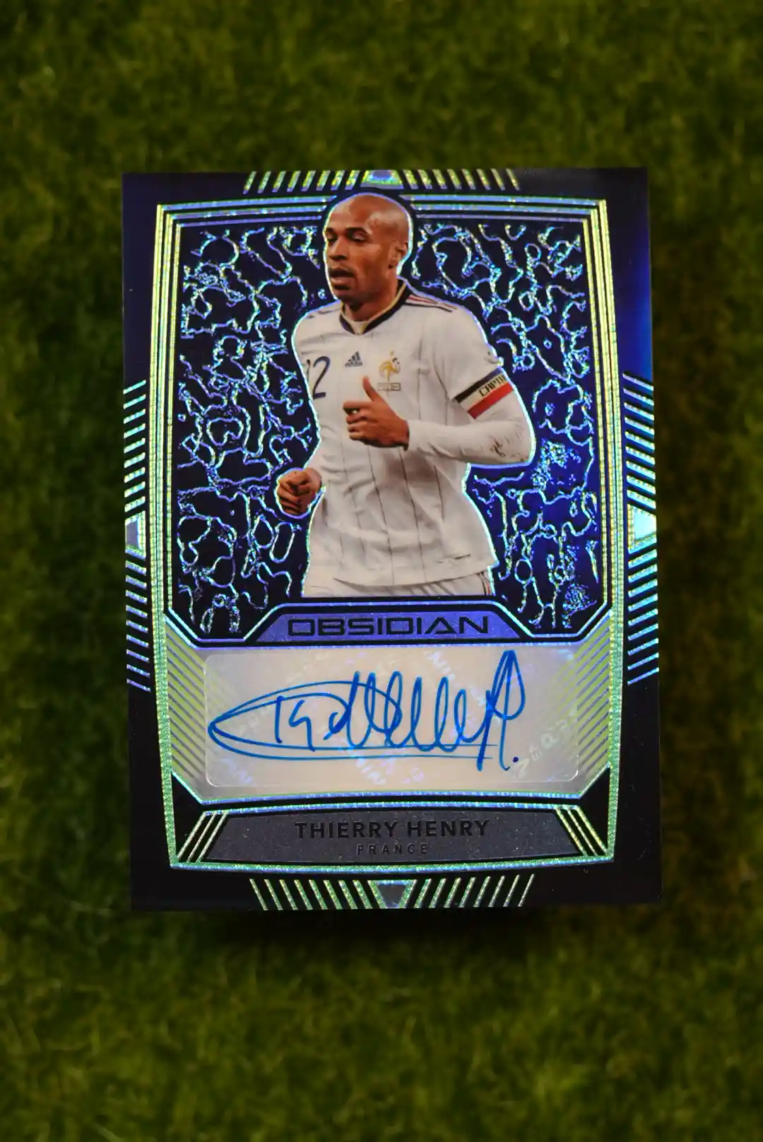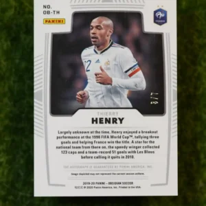 The ultimate prize for any modern card collector! This is the 2019-20 Panini Obsidian Thierry Henry Autograph White Mojo 1/1. A “one of one” card means that this is the only one in existence, making it the rarest and most desirable card possible. This masterpiece from the high-end Panini Obsidian set features a certified on-card autograph from the legendary Thierry Henry, on the stunning and unique White Mojo parallel. This is more than just a trading card; it’s a piece of art and a significant investment. It’s the pinnacle for any Thierry Henry, Arsenal, or high-end soccer card collection.