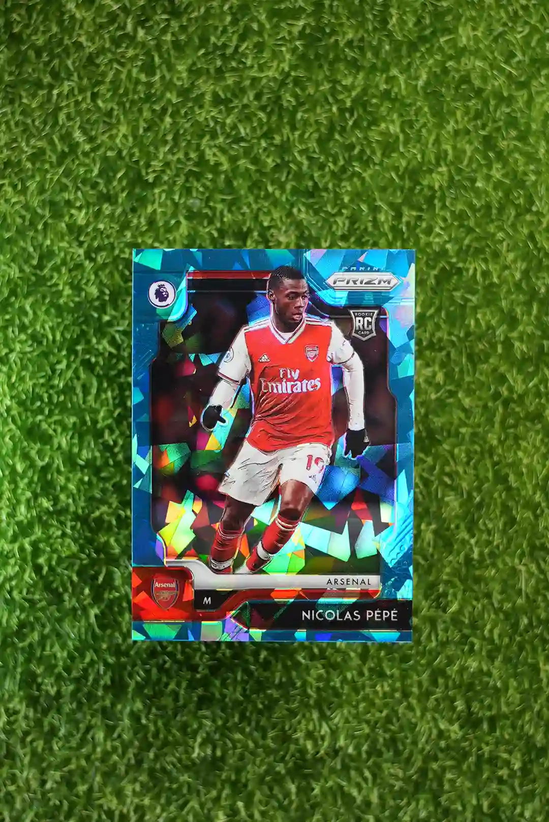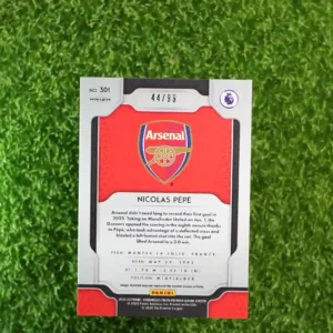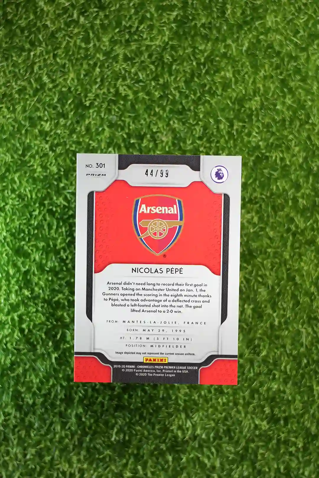 A 2019-20 Panini Prizm Nicolas Pépé Rookie Card (RC) #301, part of a limited print run out of 99.