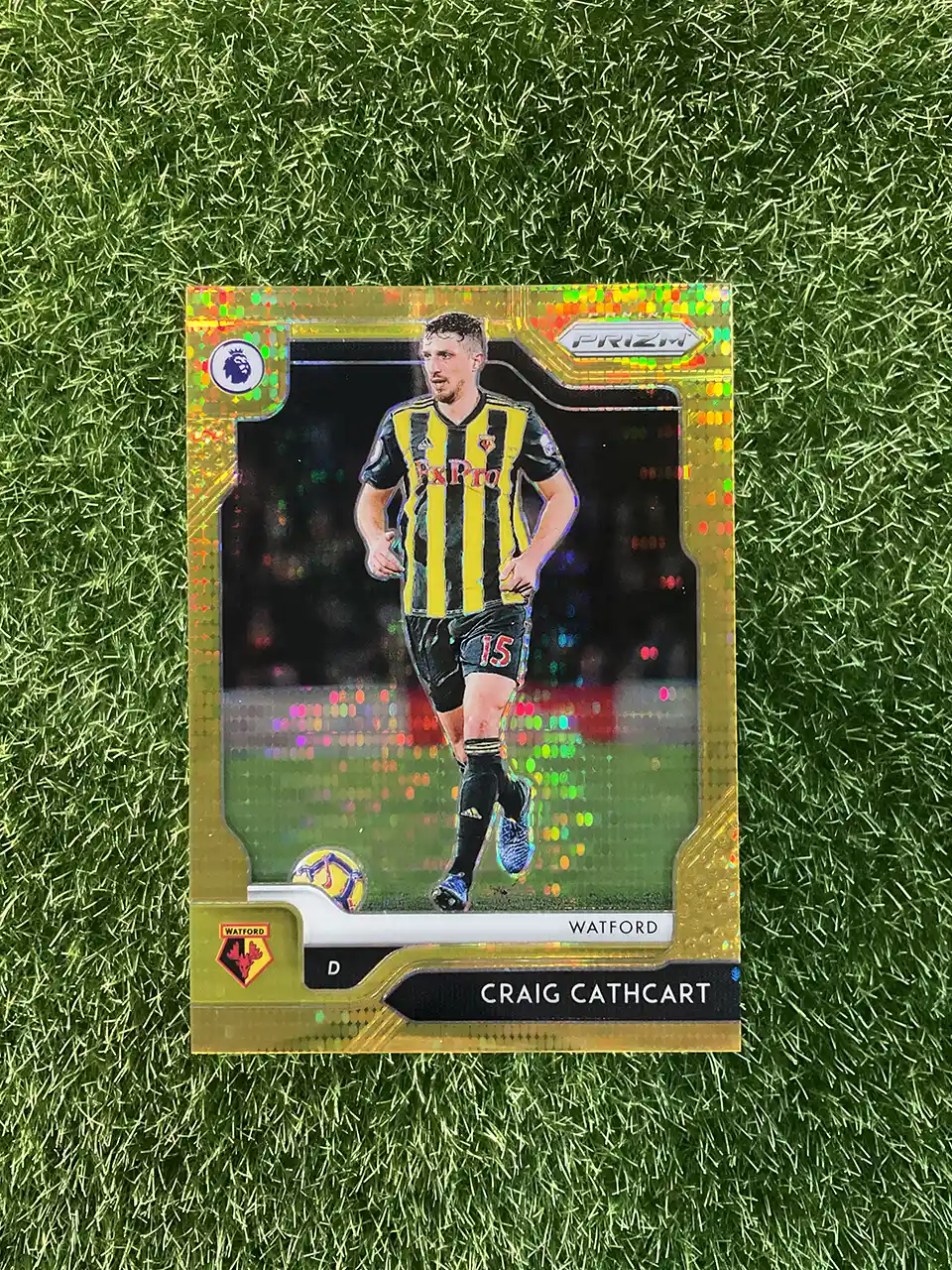 A fantastic and highly sought-after Gold Power Prizm of Craig Cathcart. This is the 2019-20 Panini Prizm Premier League Gold Power Prizm, numbered to just 10. This super short print (SSP), numbered 05/10, is a rare gem for any Watford or Northern Ireland national team collector.
