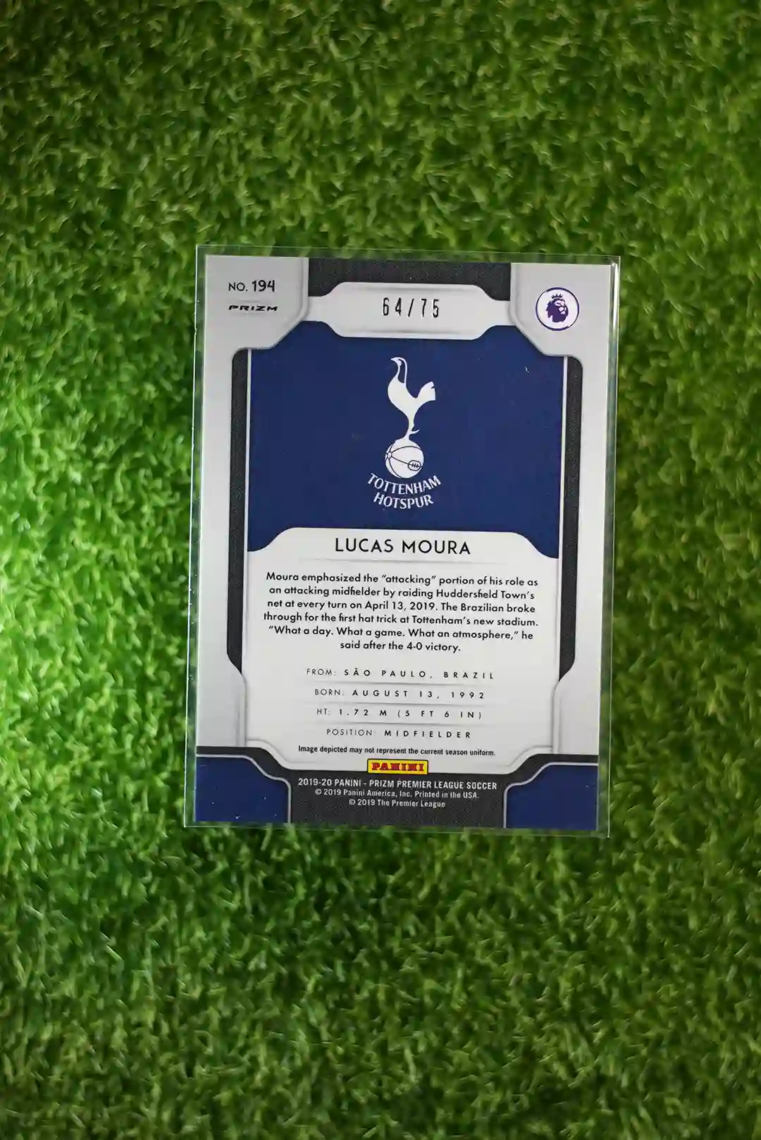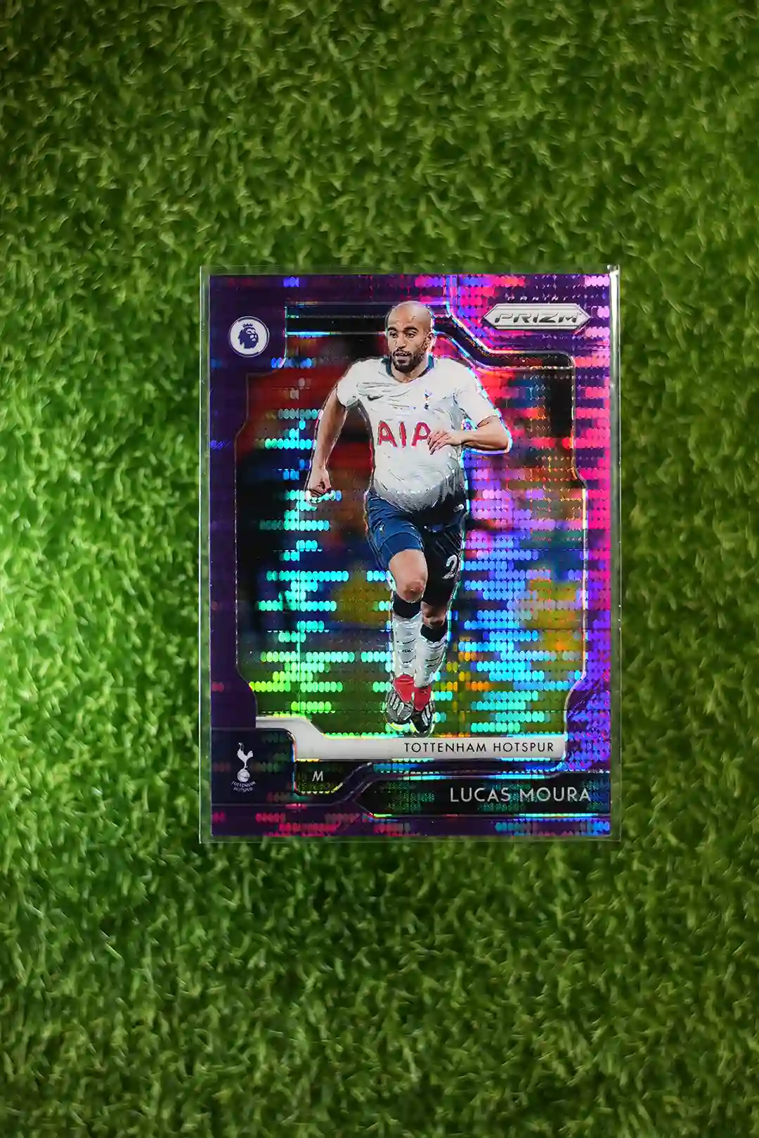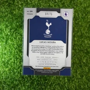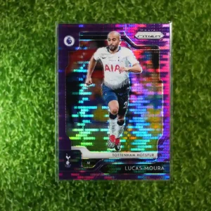 2019-20 Panini Prizm Premier League Soccer Lucas Moura Purple Prizm card, limited to 75 copies.