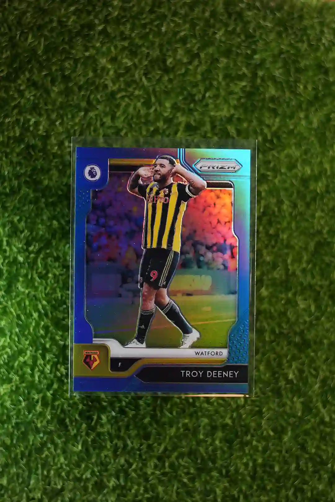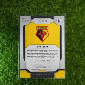 This is the 2019-20 Panini Prizm Troy Deeney Blue Prizm card, limited to 199 copies.