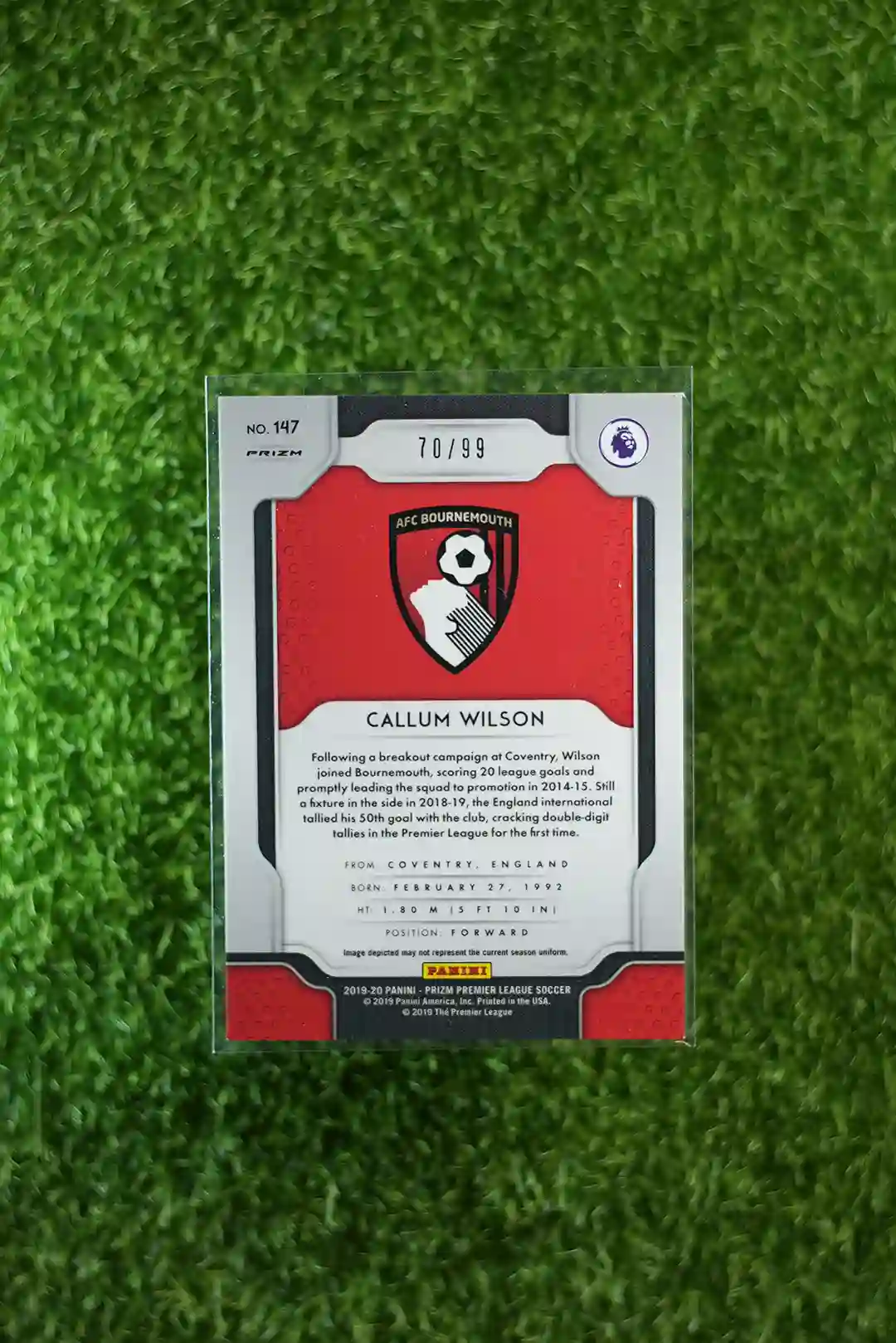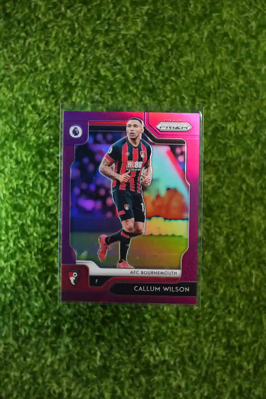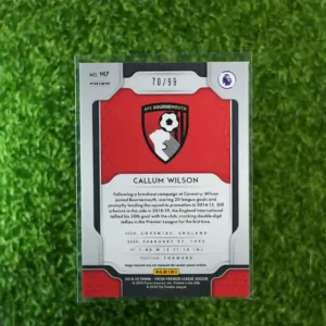 & Free Shipping2019-20 Prizm Premier League Soccer Callum Wilson Purple Prizm parallel card, limited to 99 copies.