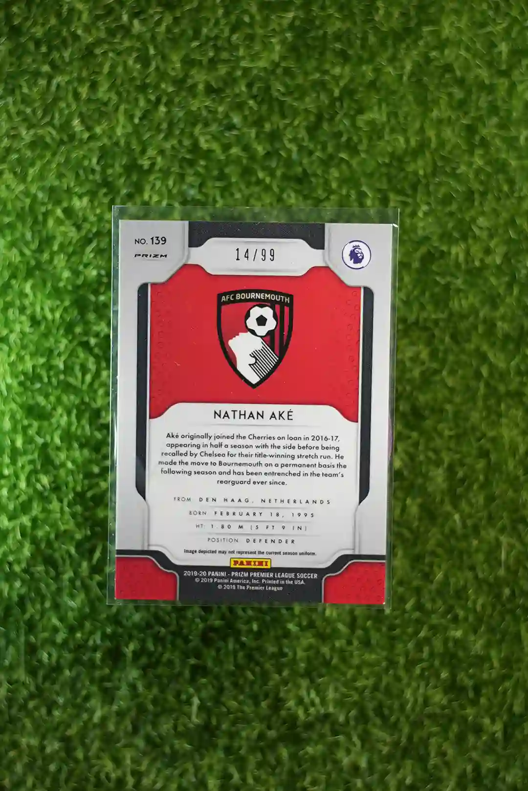 & Free Shipping2019-20 Prizm Premier League Soccer Nathan Aké Purple Prizm parallel, serial numbered to 99 copies.