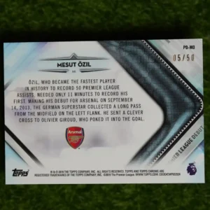 An iconic card of a modern football artist! This is the 2019-20 Topps Chrome Premier League Mesut Özil Premier League Debut Gold Refractor, serial numbered to 50. The Gold Refractor is one of the most legendary parallels in the history of the hobby, and this card is a stunning example. It commemorates Mesut Özil’s Premier League debut, making it a historically significant card as well. The combination of the iconic player, the legendary parallel, and the premium Topps Chrome brand makes this a true “grail” card for any Arsenal or Mesut Özil collector.