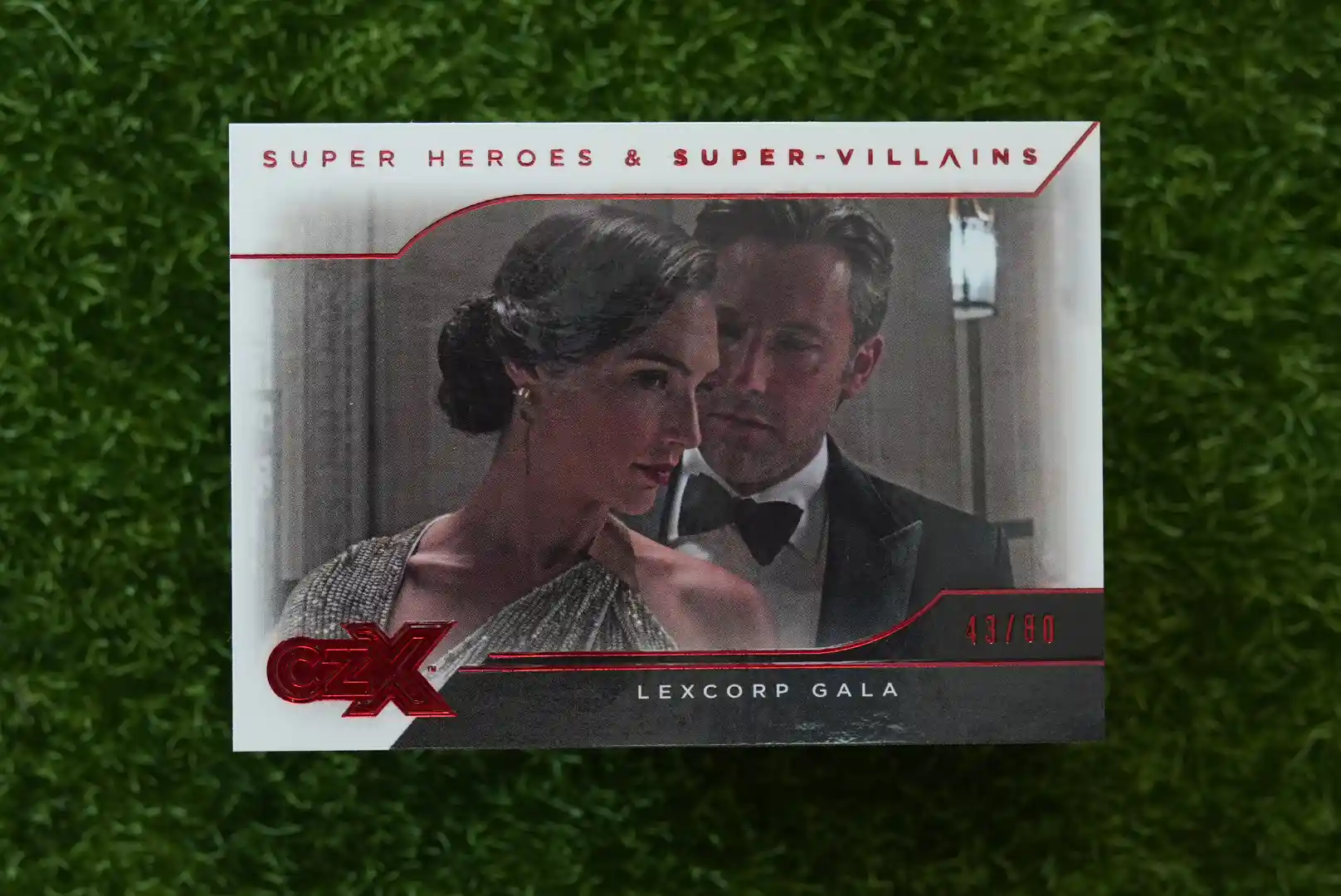 A high-end collectible from a blockbuster film! This is the 2019 Cryptozoic CZ-X Super Heroes & Super-Villains Batman v Superman “Lexcorp Gala” Red Parallel, numbered to 90. This card from the premium CZ-X set captures a pivotal scene from “Batman v Superman: Dawn of Justice.” The ‘Lexcorp Gala’ is where the heroes and villains converge, making this a key moment in the film’s narrative. The card’s thick, premium stock and the rarity of the Red parallel make it a fantastic item for any collector of the DC Extended Universe. It’s a sophisticated and limited piece of movie memorabilia.