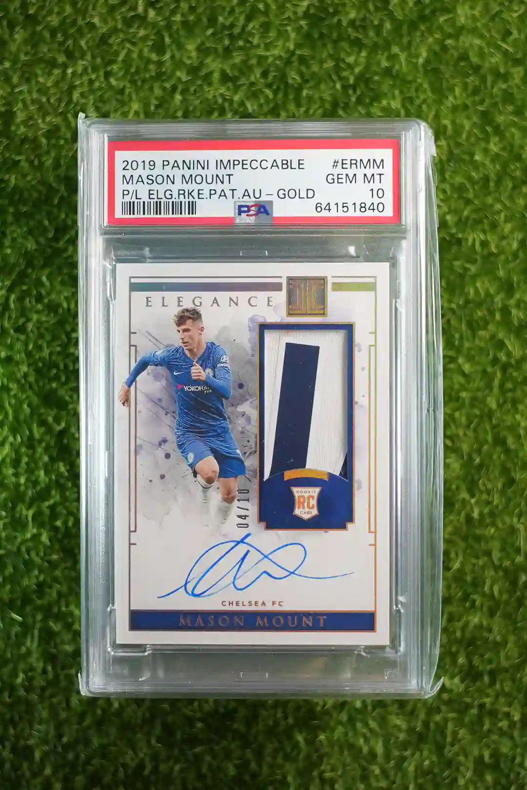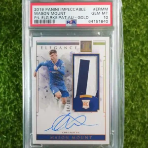 & Free ShippingA stunning 2019 Panini Impeccable Soccer Elegance Rookie card featuring Mason Mount. This highly sought-after card includes a player-worn patch, a crisp on-card autograph, and is the rare Gold parallel, limited to a print run of just 10 copies. It has been professionally graded a perfect PSA 10 Gem Mint.