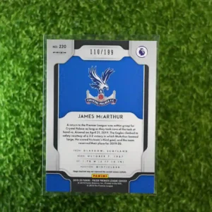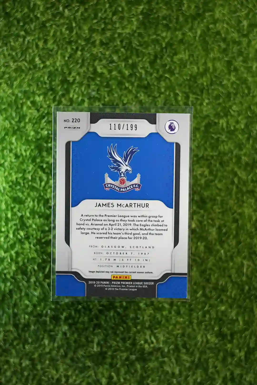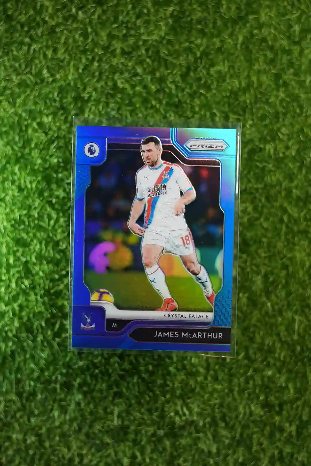 & Free Shipping2019 Prizm Premier League Soccer James McArthur Blue Prizm parallel card, numbered to 199 copies.