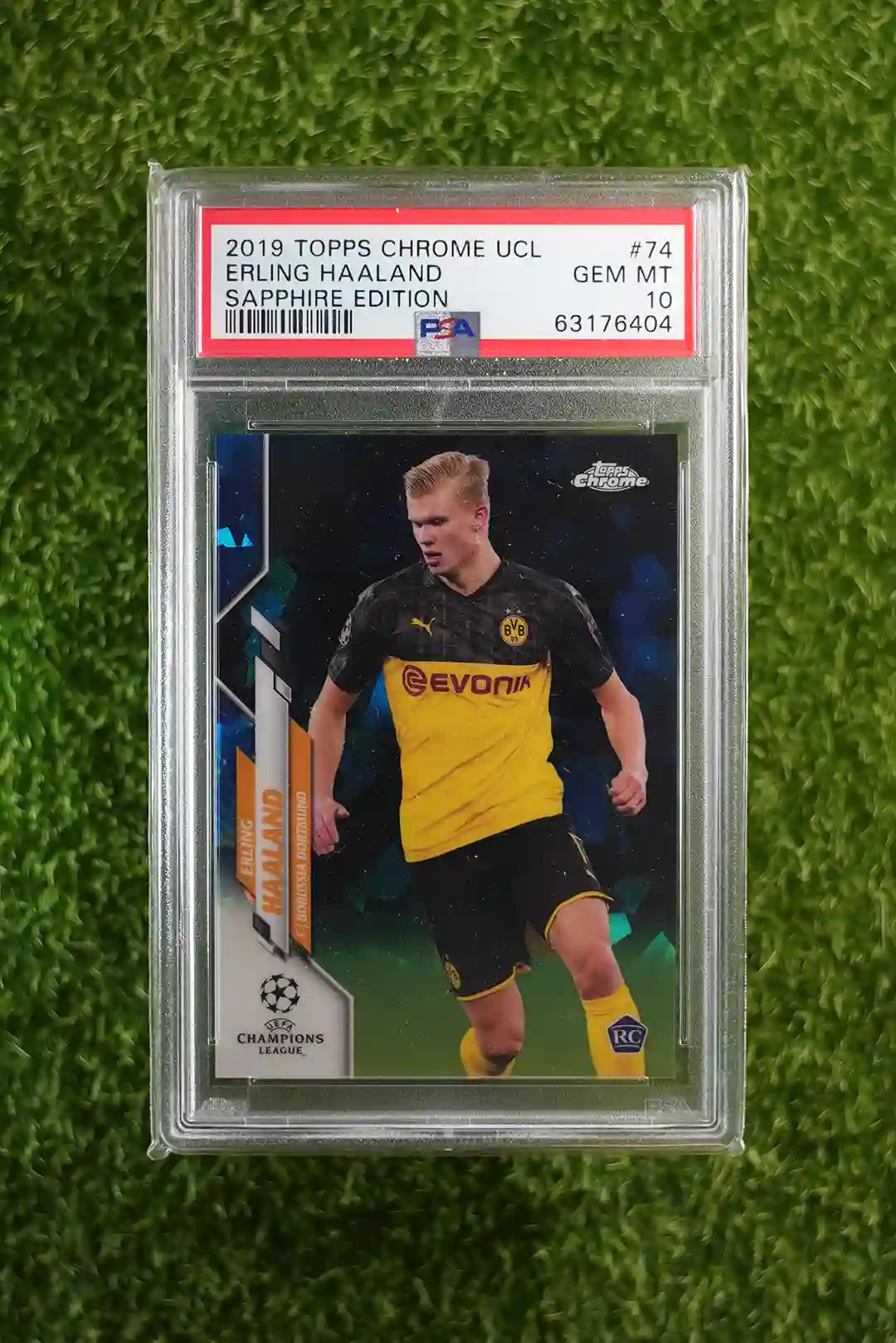 & Free ShippingA highly coveted 2019 Topps Chrome UCL Sapphire Edition card featuring football star Erling Haaland, professionally graded PSA 10.