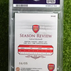 An incredibly rare card of an explosive talent, this is the 2020-21 Futera Gabriel Martinelli Season Review Red parallel, with a print run of just 5. Futera is a brand known for its high-quality, limited-edition releases, and this card is a prime example. It celebrates the progress of Gabriel Martinelli at Arsenal, and the Red parallel is among the most scarce versions available. For dedicated Arsenal fans and serious player collectors, this card’s extreme rarity makes it a true “grail.” It’s a unique and valuable piece that stands apart from the mainstream releases, offering exclusivity and long-term potential.