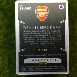 A modern and industrial-style autograph of a classic player! This is the 2020-21 Panini Impeccable Dennis Bergkamp Stainless Stars Auto, numbered to a rare 10 copies. The ‘Stainless Stars’ insert is one of the most unique in the hobby, featuring a player’s autograph on a real steel or metal card. This gives the card a substantial weight and a premium feel unlike any other. This card combines the modern, high-tech design of Impeccable with the timeless class of Dennis Bergkamp. For collectors looking for a truly unique and rare autograph, this is a fantastic and valuable piece.
