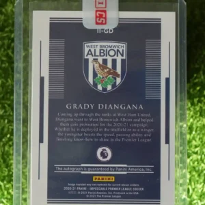 A premium autograph of a promising talent! This is the 2020-21 Panini Impeccable Grady Diangana Autograph, numbered to just 35 copies. This card from the high-end Impeccable set features a certified on-card signature from the exciting winger, Grady Diangana. The low print run and the premium quality of the Impeccable brand make this a very desirable and valuable card. For fans of West Bromwich Albion or collectors of young English talent, this is a fantastic and rare autograph to add to their collection.