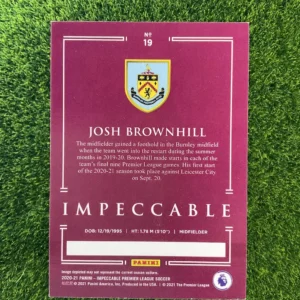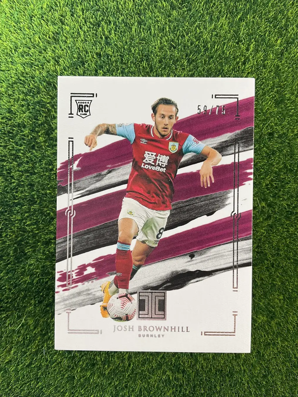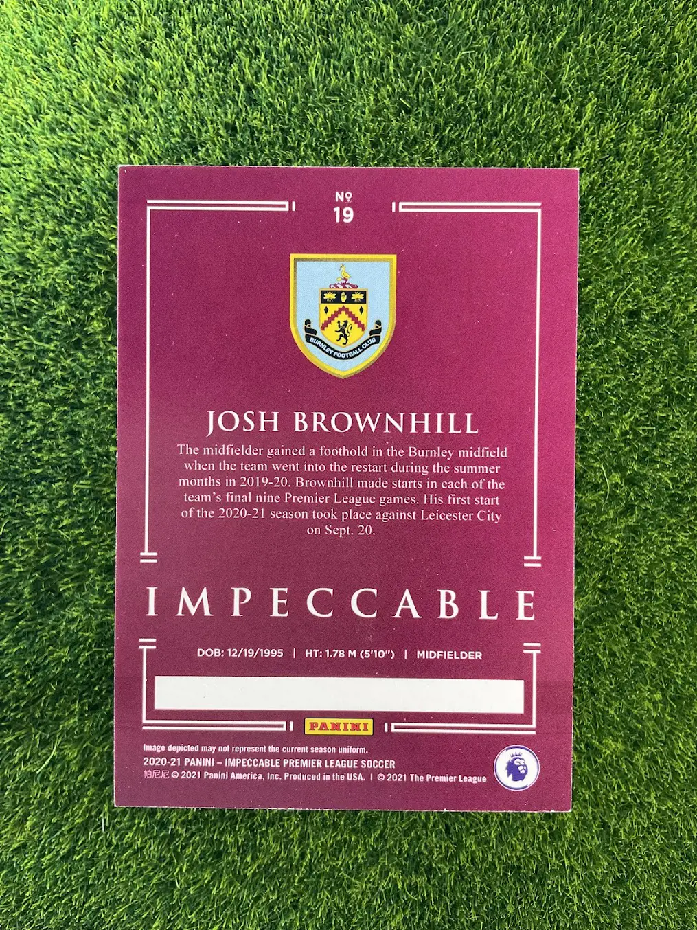 A premium rookie card of the Burnley midfielder, Josh Brownhill. This is the 2020-21 Panini Impeccable rookie card (RC). The Impeccable brand is a high-end product, making this a very desirable rookie card for investors and collectors. This is a limited edition, hand-numbered 59 out of 75, ensuring its scarcity. A great addition to any rookie card collection.