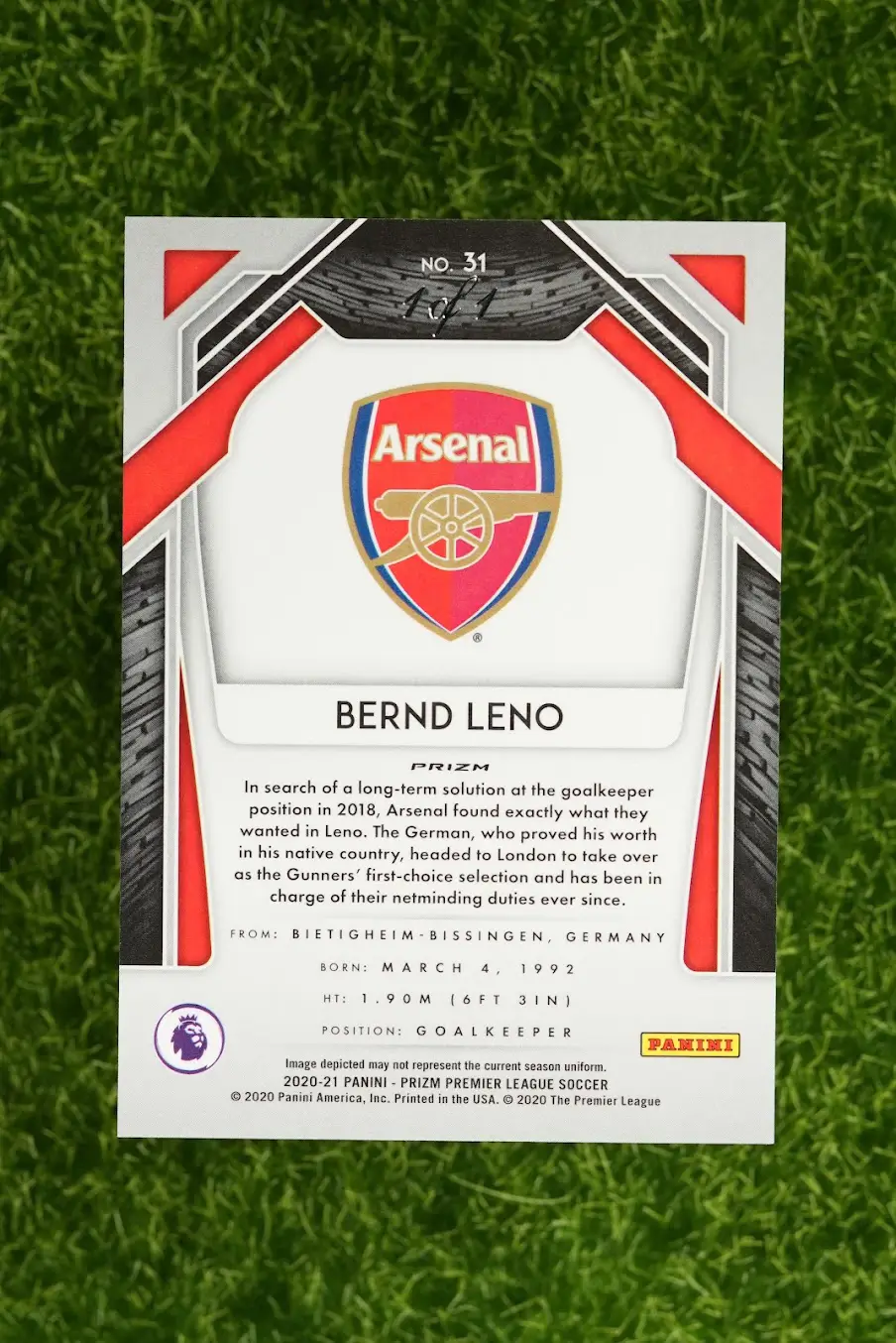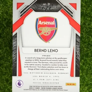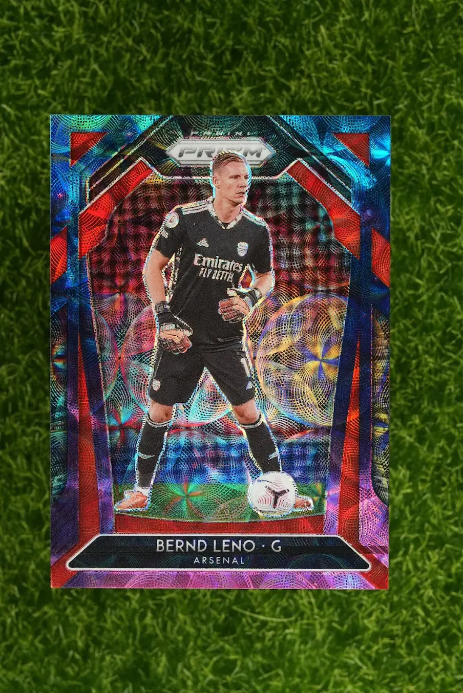 The ultimate chase card! This is the 2020-21 Panini Prizm Bernd Leno Hyper Prizm Nebula, a true one-of-a-kind, 1/1 masterpiece. The Nebula parallel is the rarest and most sought-after parallel in the entire Panini Prizm rainbow, featuring a unique, swirling, space-like design. There is only one of these cards in the entire world. This is not just a card; it’s an investment and the centerpiece of any collection. An unparalleled opportunity for the ultimate Bernd Leno or Arsenal collector.