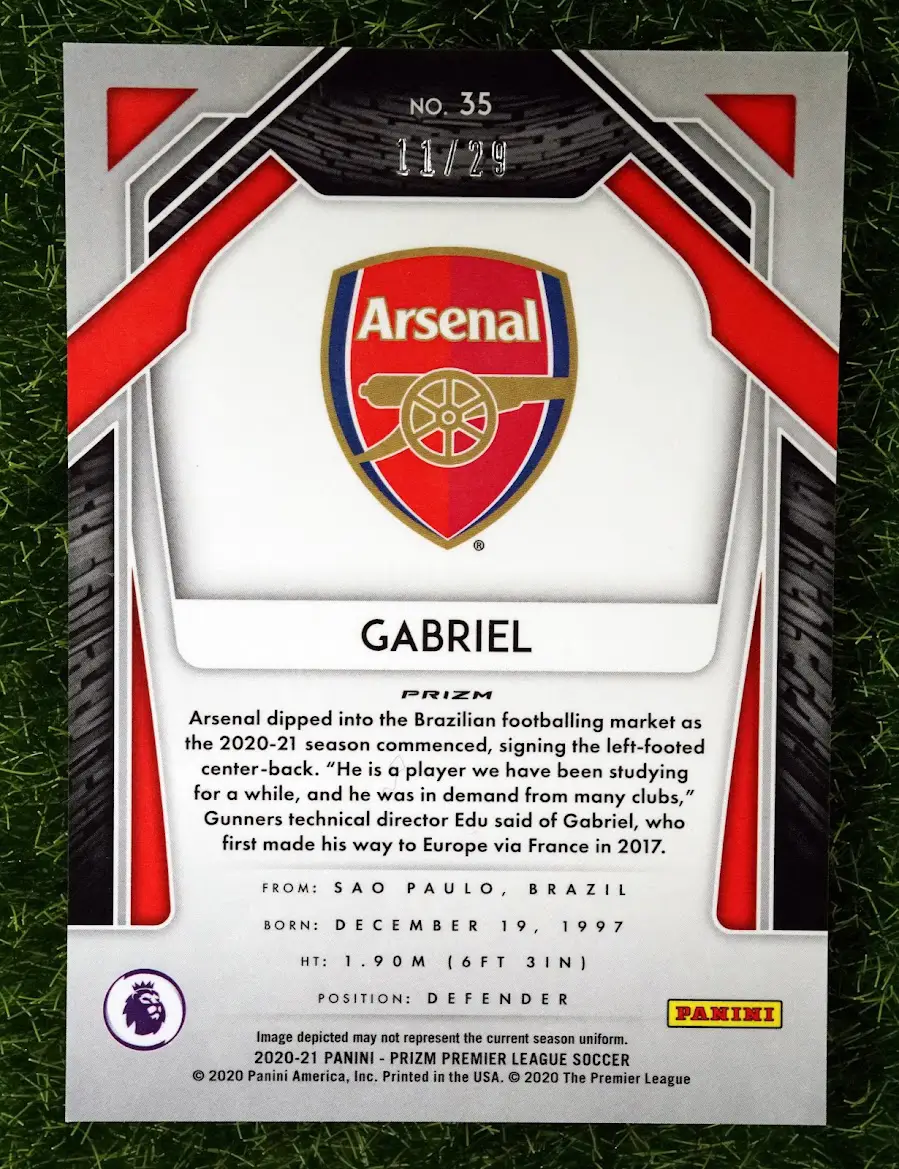 A stunning and incredibly rare rookie card of the Arsenal and Brazil defender, Gabriel Magalhães. This is the 2020-21 Panini Prizm Premier League Red Pulsar Prizm rookie card (RC), numbered to just 29. The Red Pulsar is one of the most sought-after parallels, making this super short print (SSP), numbered 11/29, a fantastic investment.