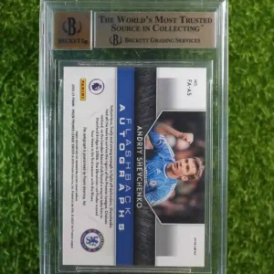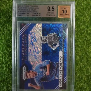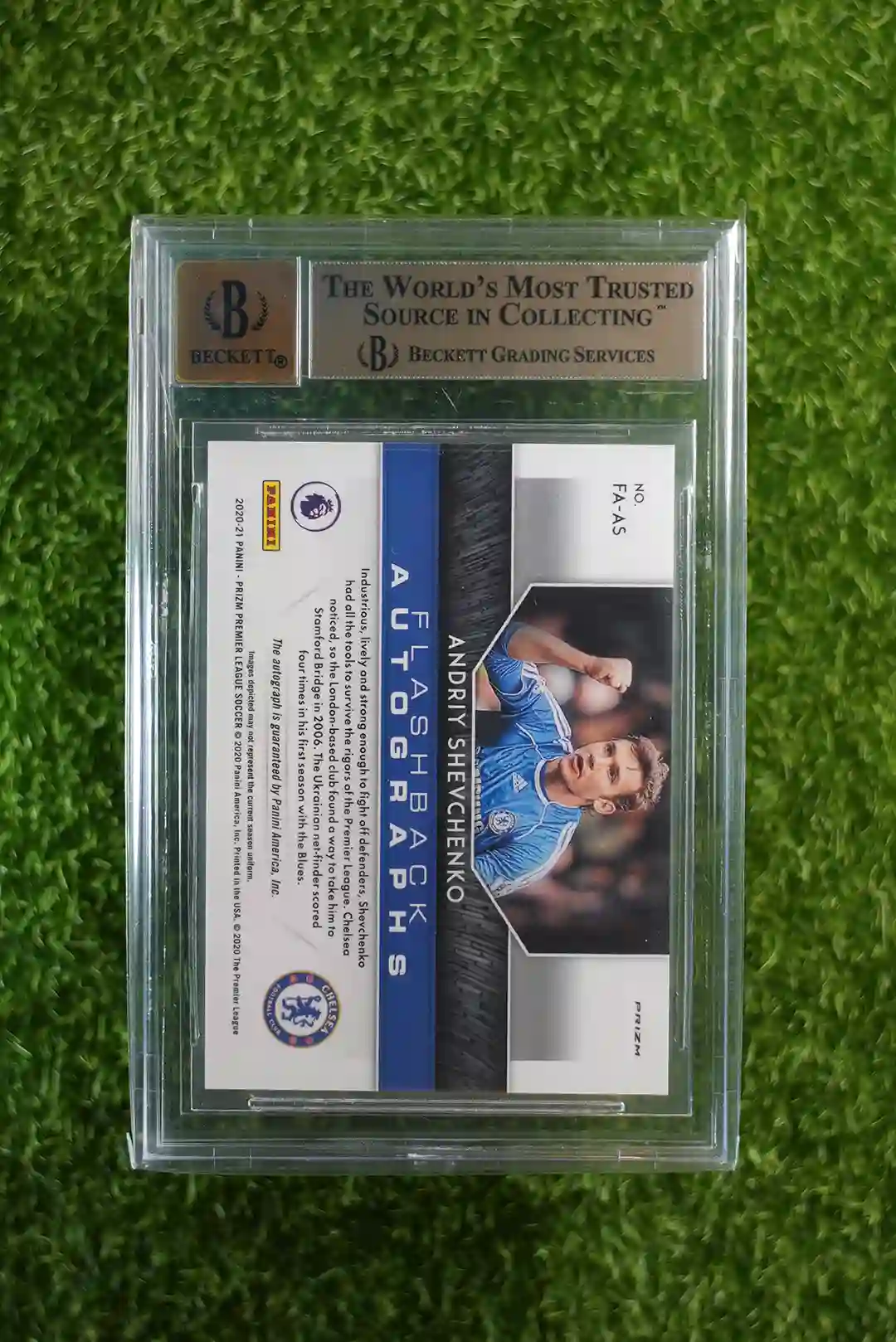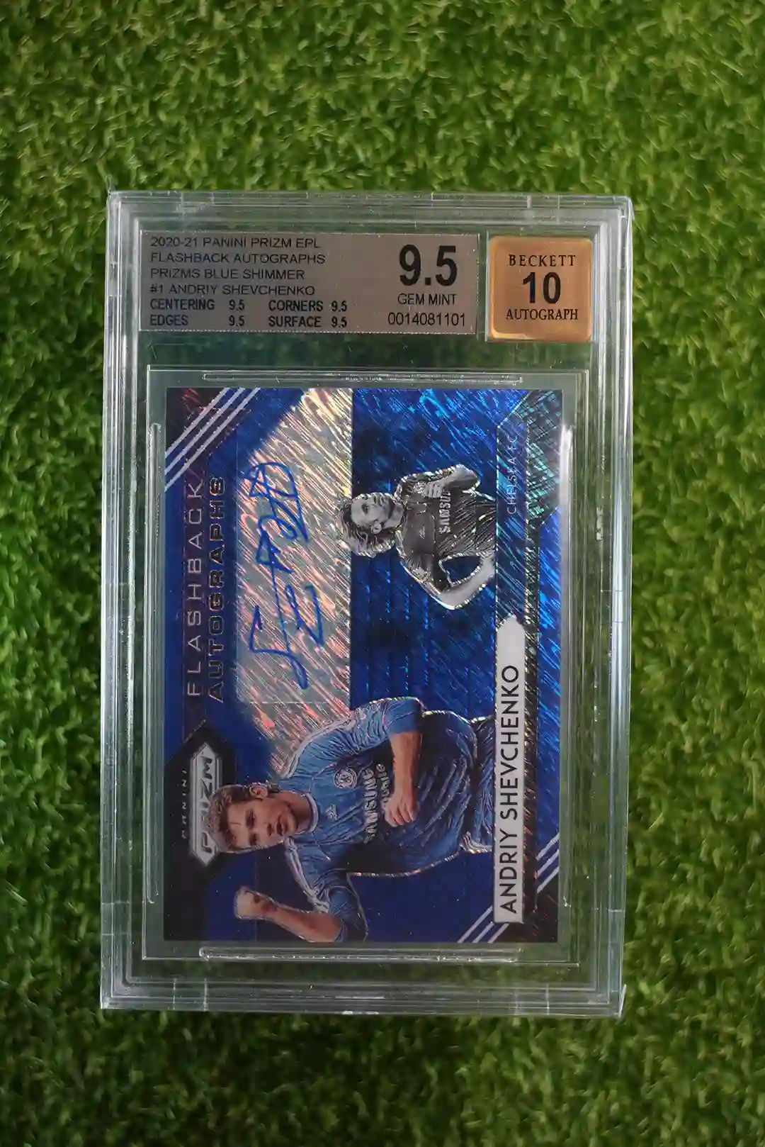 & Free ShippingStunning 2020-21 Prizm EPL Andriy Shevchenko Flashback Autographs Prizms Blue Shimmer card, graded BGS 9.5 with a perfect 10 for the autograph.