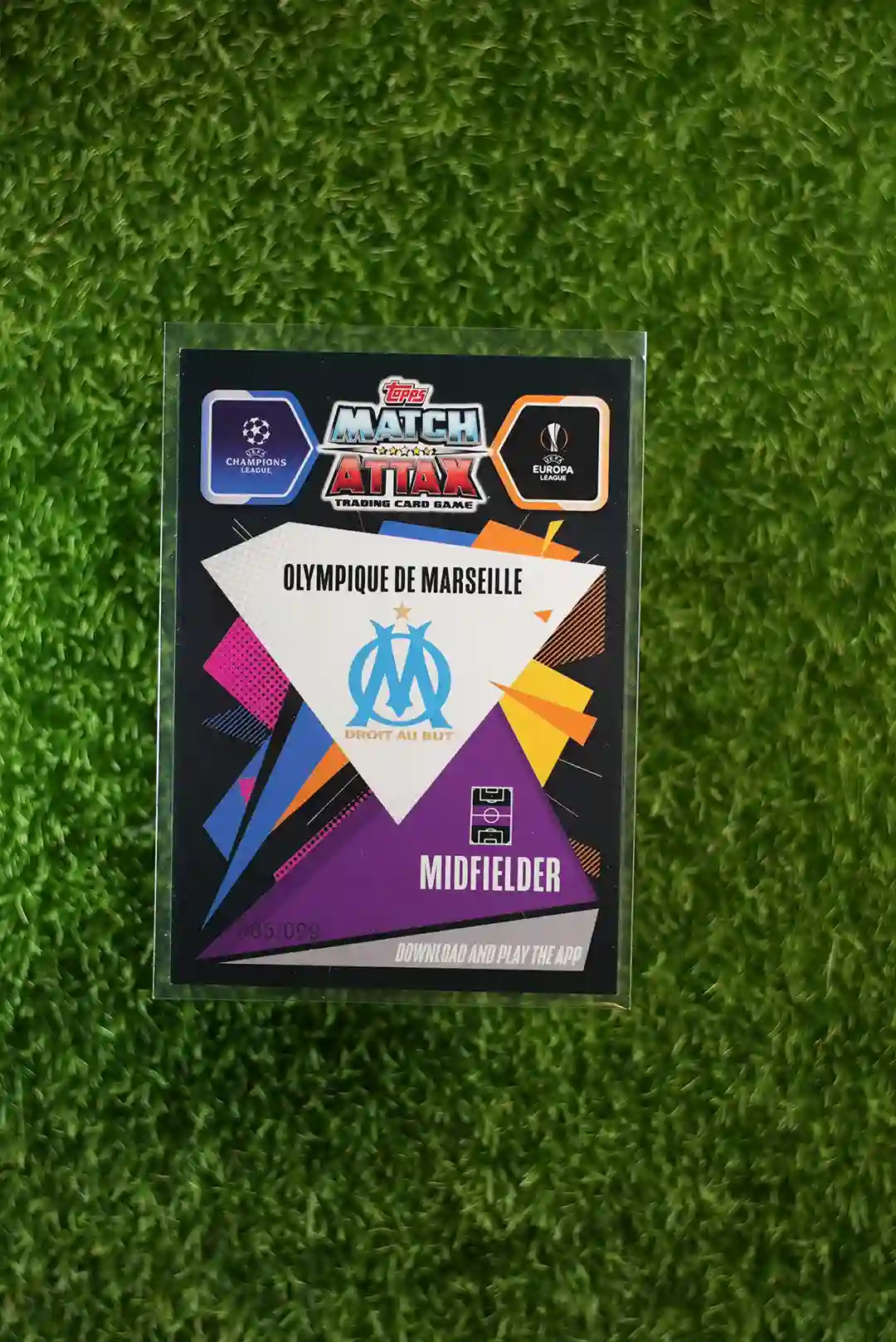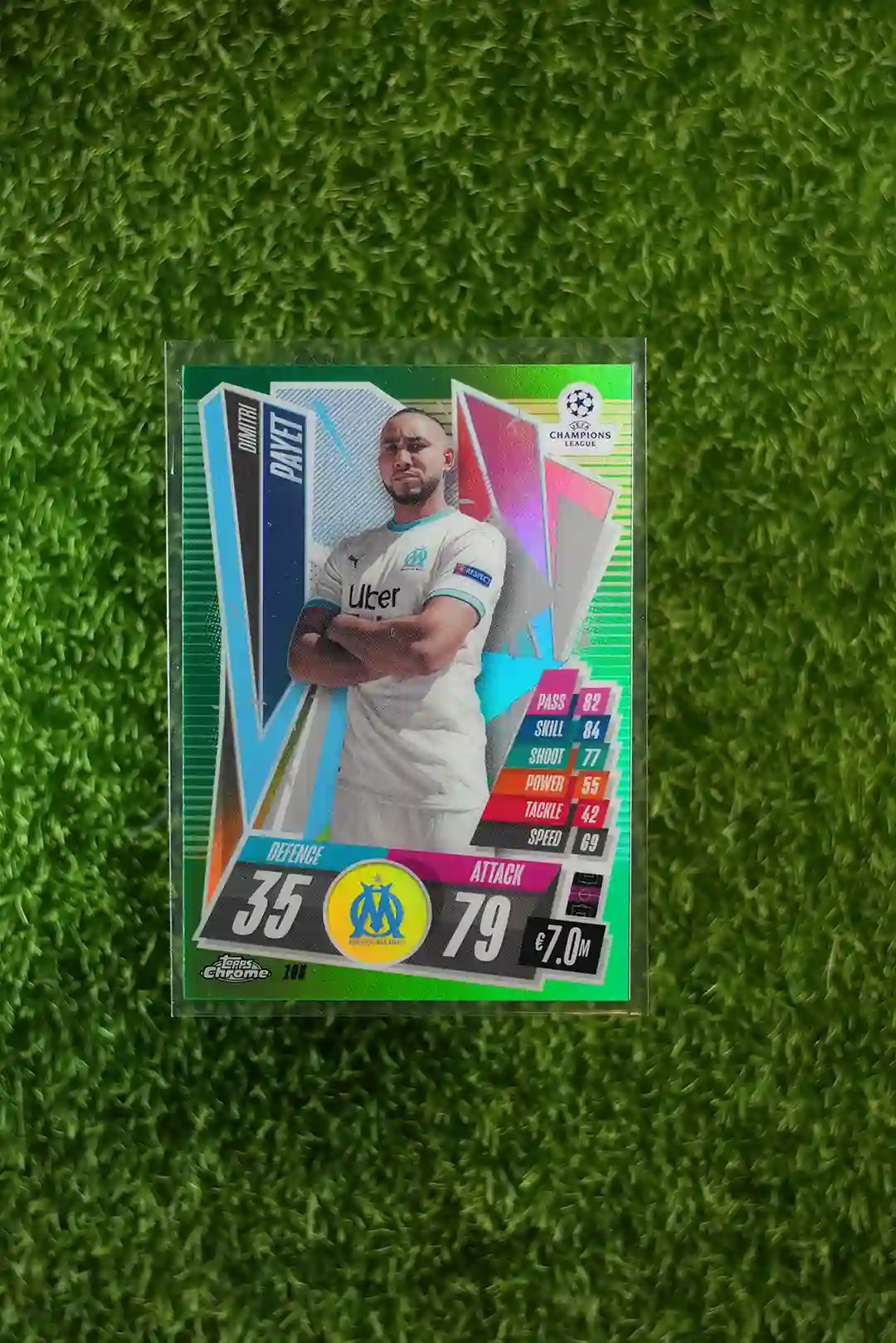 2020/21 Topps Match Attax Dimitri Payet Green Chrome parallel. Limited to a print run of 100.