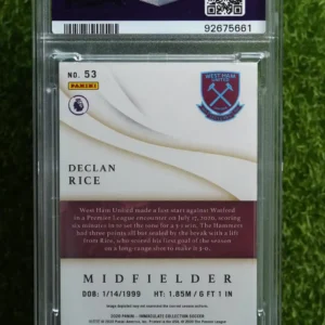 Add a piece of modern midfield mastery to your collection with the 2020 Panini Immaculate Collection Declan Rice Sapphire parallel, numbered to just 25. The Immaculate Collection is one of Panini’s most prestigious and high-end brands, known for its clean designs and premium card stock. This card features Declan Rice, one of the premier defensive midfielders in world football, and the Sapphire parallel adds a beautiful touch of blue to the elegant design. For fans of Arsenal, West Ham, and the England national team, this rare and sophisticated card is a fantastic way to celebrate the career of a player in his prime.